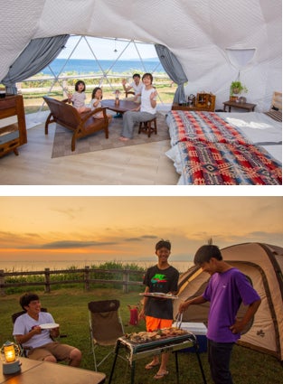 かもめ島頂上、灯台ふもとに設置されたグランピングテントに宿泊しながら、地元食材を使用した料理と海洋体験が楽しめる宿泊プランです。1日1組限定、日本海に沈む夕陽や壮大なロケーションのもと、特別感を満喫出来ます。