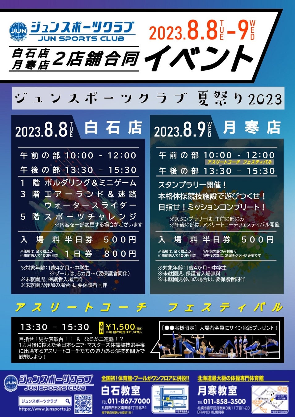 ジュンスポーツクラブ白石教室では、8月8日(火)に午前の部と午後の部の2回、大規模な遊びを展開します。1階から5階までのスペースを利用し、お祭りならではの楽しさを体験できる縁日や、白石店限定のボルダリングやプール開放、エアーランド&迷路、そしてスポーツチャレンジなど様々なアクティビティが用意されています。入場料は午前・午後の部それぞれ500円(税込み)、1日券は800円(税込み)です。