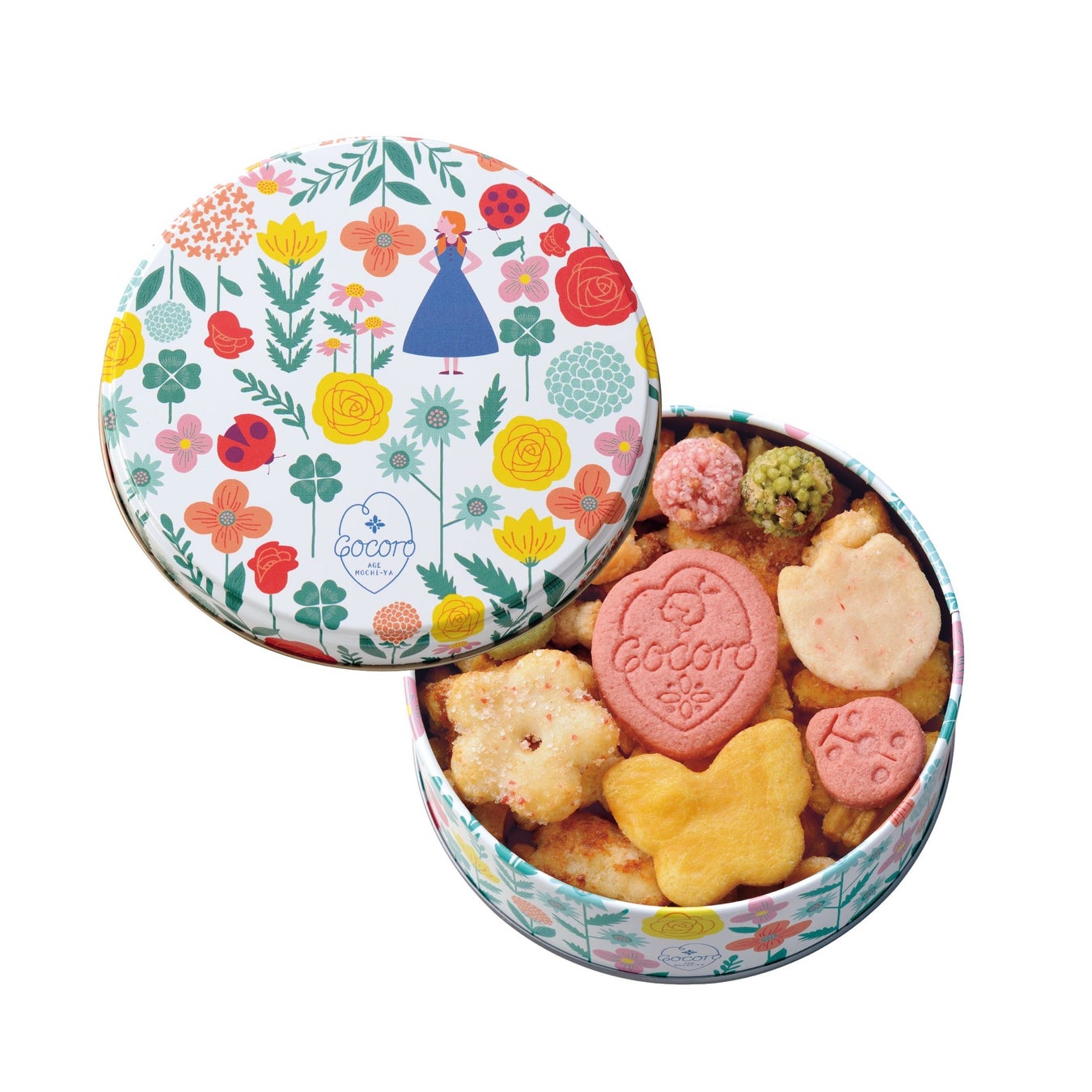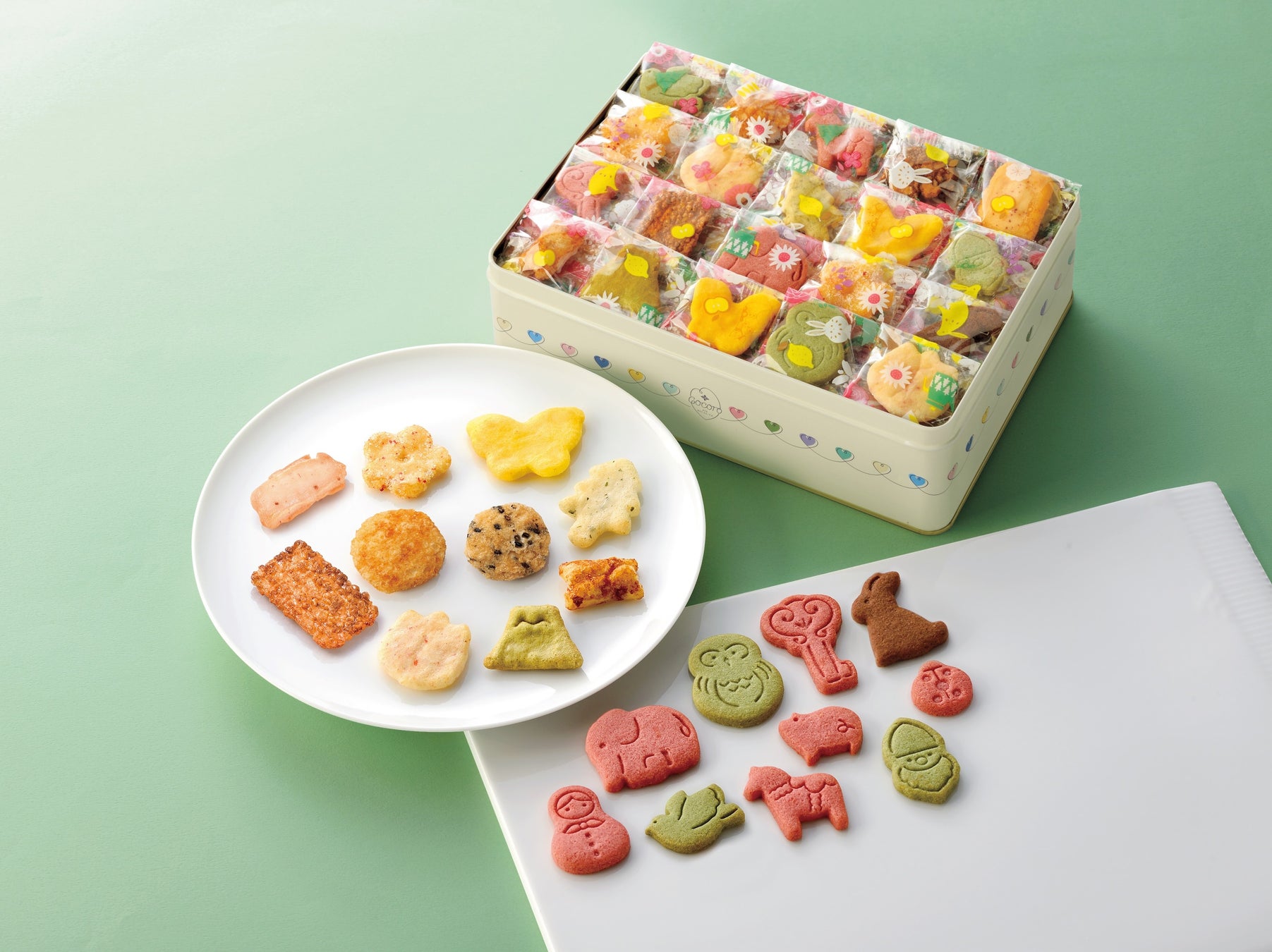 - 世界中のラッキーチャームをかたどった米粉入りクッキーが入った「あげもちCocoroミニ缶」