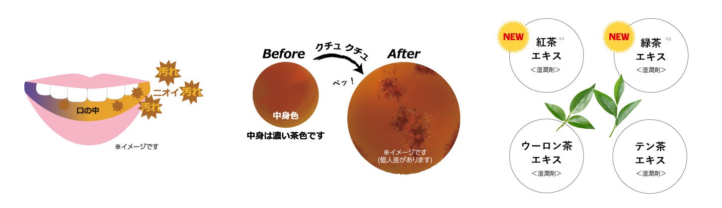 今回のリニューアルでは、お茶成分が3種からより厳選した4種になり、磨き残しなどの除去効果が向上し、
