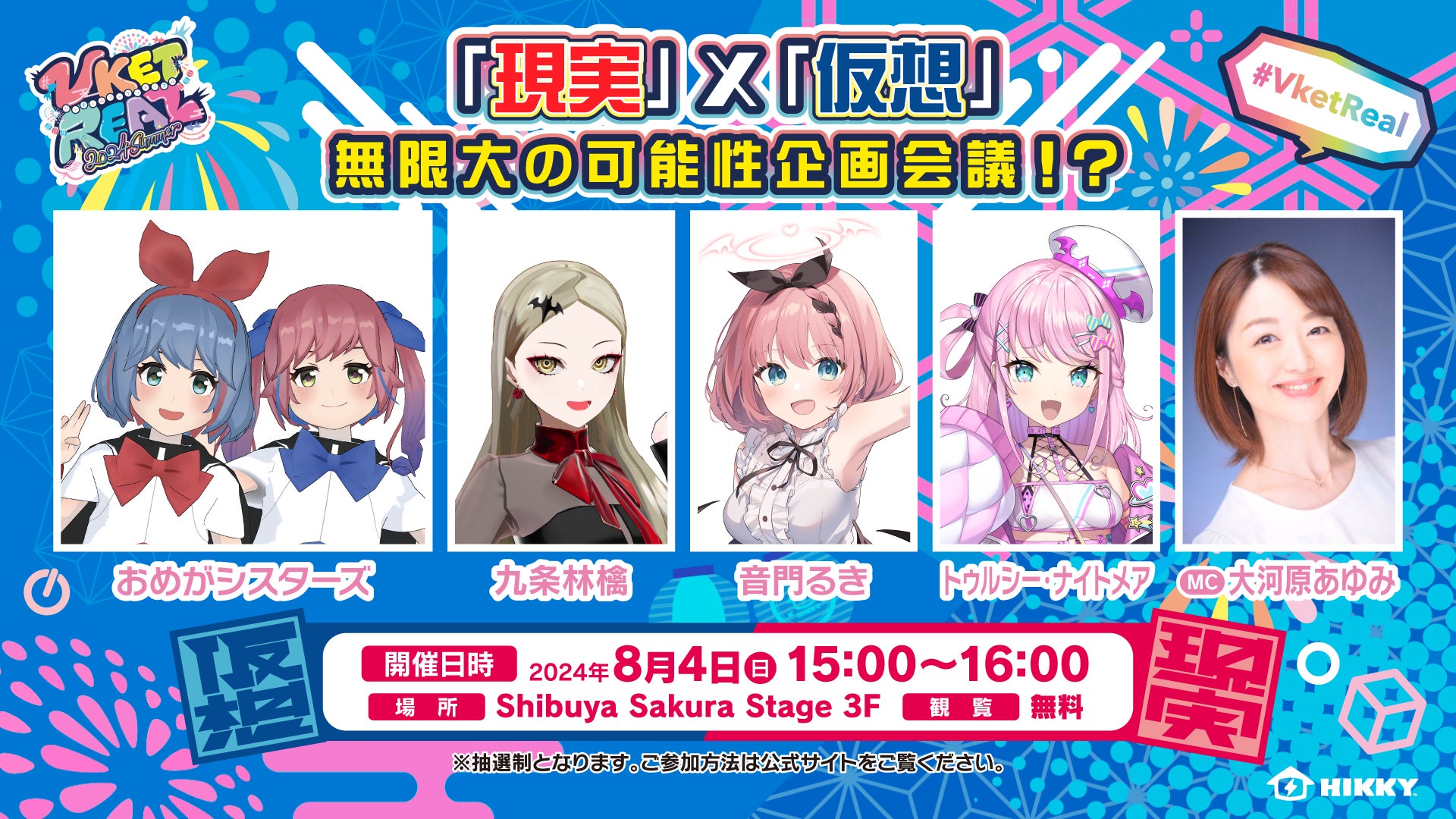 リアルとバーチャルが混ざり合うお祭りイベントVketRealの場で、「「現実」と「仮想」が混ざり合うことで起きる化学反応」をテーマに、無限大の可能性を摸索した企画をVTuberのみなさんと会議!!ここでしか聞くことが出来ないトークショーをお楽しみください!