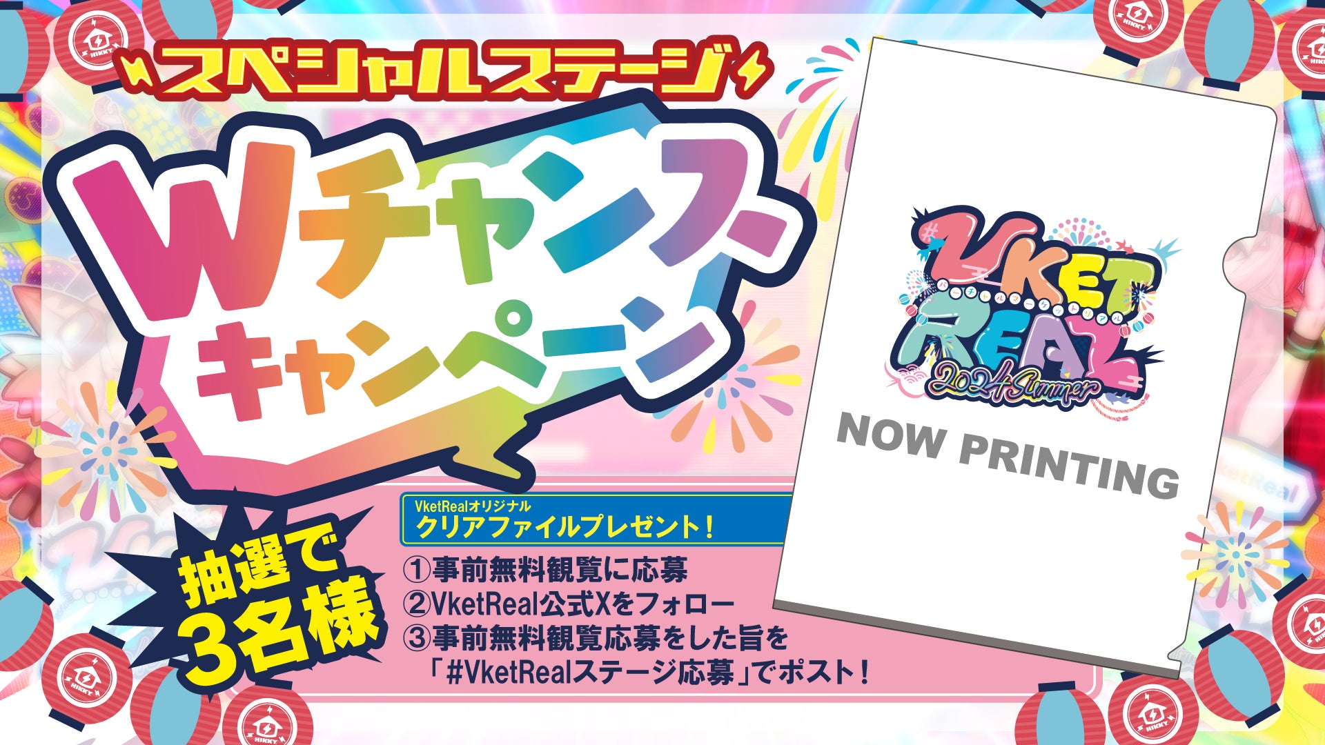 事前無料観覧に応募をしてくれた方にWチャンスキャンペーンを実施!VketReal公式Xをフォローの上、事前無料観覧応募をした旨を「#VketRealステージ応募」をつけてポストされた方の中から、抽選で3名様にVketRealオリジナルクリアファイルをプレゼント!!本キャンペーンにも奮ってご参加ください!