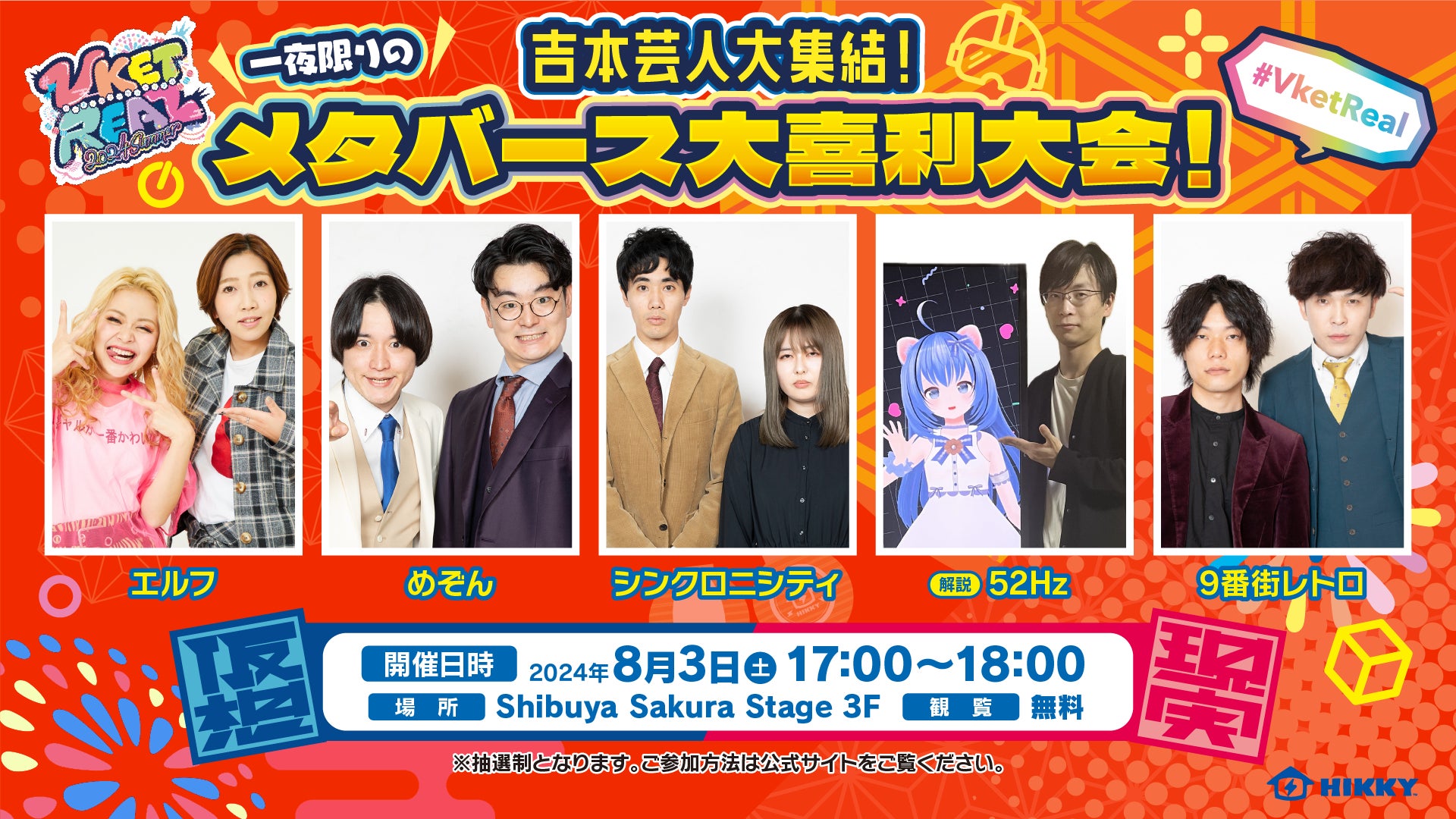 陣内智則・野田クリスタル・エルフさんら人気芸人が大集合!のばまん・ネフライトさんら人気配信者や、井上和彦さんなど人気声優も多数登場するVket Realスペシャルステージ、無料観覧者を募集!!
