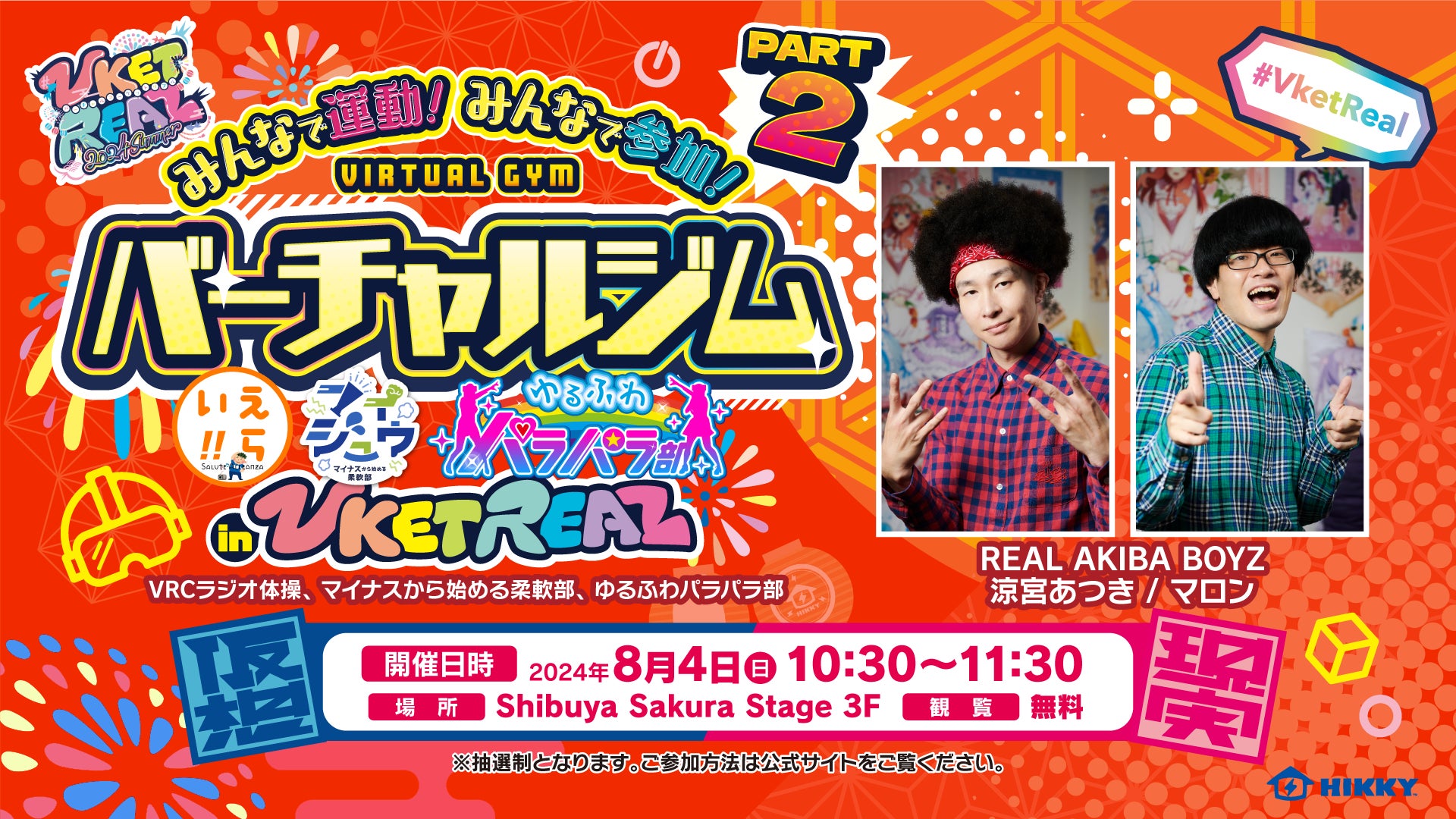 ラジオ体操、パラパラなどで、日ごろの運動不足を、朝からみんなで解消しよう!というステージです!!普段からメタバース内で運動を行っているコミュニティの方々をバーチャルでお呼びし、コーチしてもらいつつ会場の皆さんと一緒に体を動かしていきましょう!さらに!今回はレペゼン秋葉原のヲタクダンサーチーム「REAL AKIBA BOYZ」の涼宮あつきさん、マロンさんをゲストにお招きして、RABさんも一緒にエクササイズしてくれるパートがありますよ!