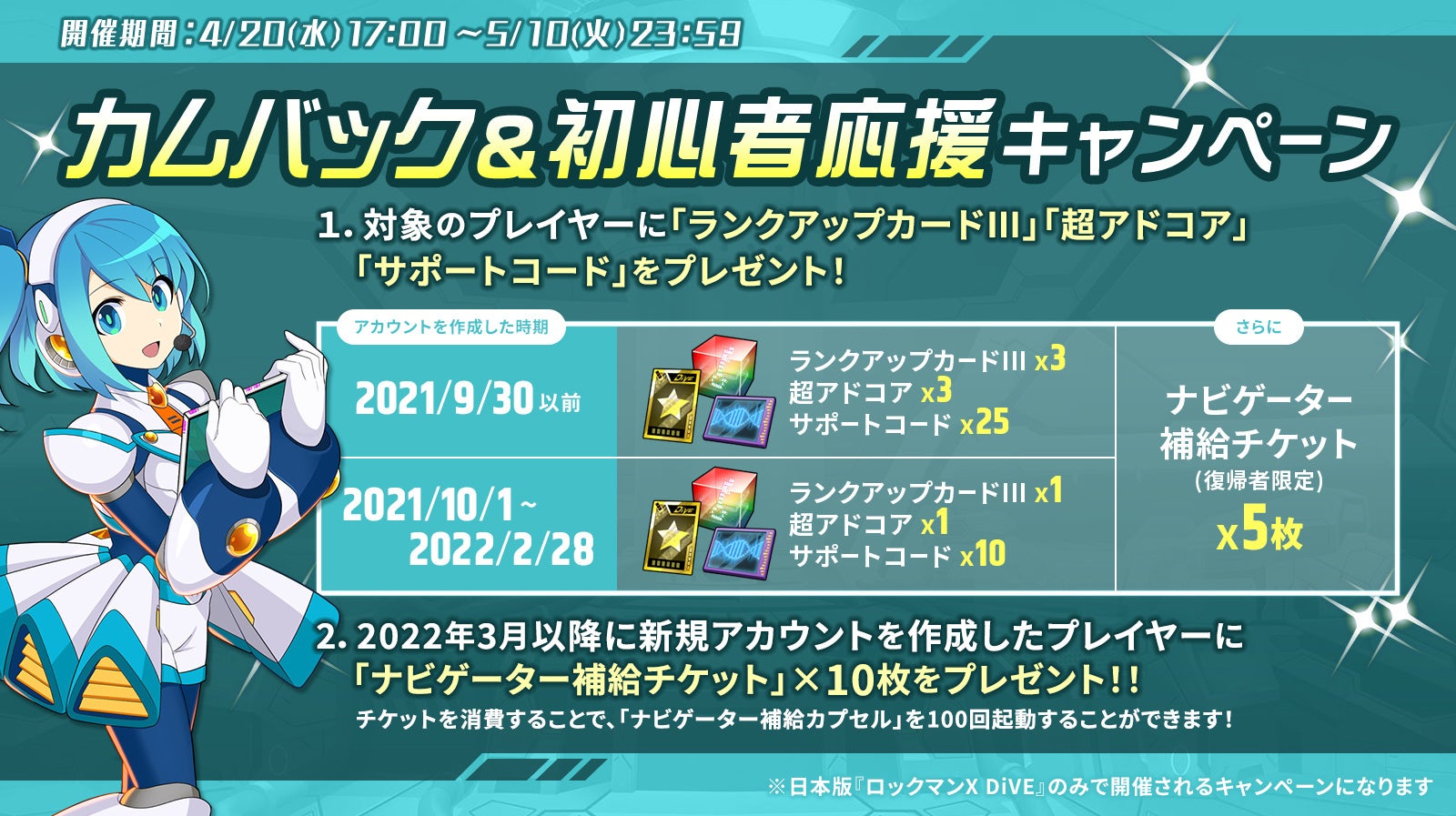 アカウントを作成した時期に応じた個数の「超アドコア」、「ランクアップカードⅢ」、「サポートコード」と、「ナビゲーター補給チケット(復帰者限定)」×5をプレゼント!