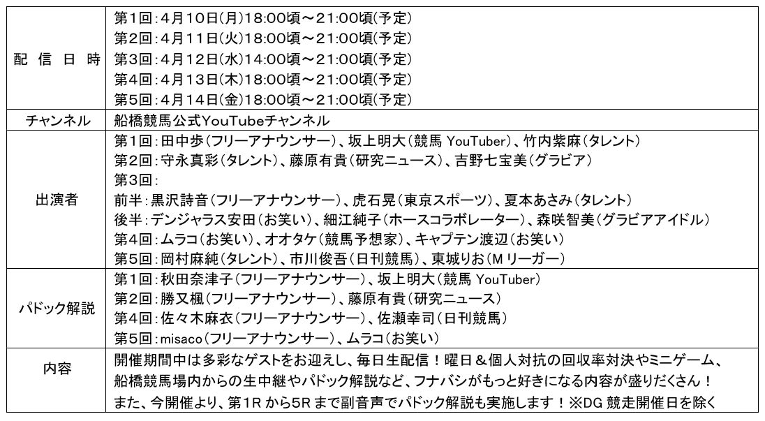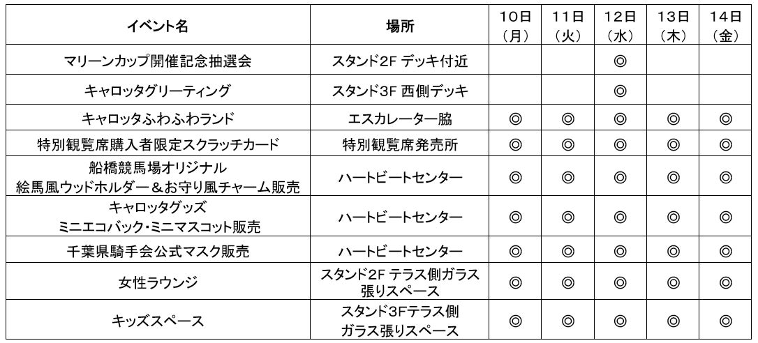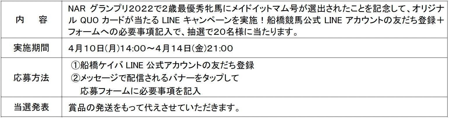第1回開催は、「マリーンカップ(JpnⅢ)」の開催を記念して、海の幸づくしの5日間!シーフードグルメが味わえるキッチンカーや、千葉県の海産物などが当たるマリーンカップ開催記念抽選会を実施します。また、メイドイットマム号のNARグランプリ2022 2歳最優秀牝馬受賞を記念して、抽選で20名様にメイドイットマム号オリジナルQUOカードが当たるLINEキャンペーンを実施します。盛りだくさんの令和5年度最初の開催をぜひお楽しみください。