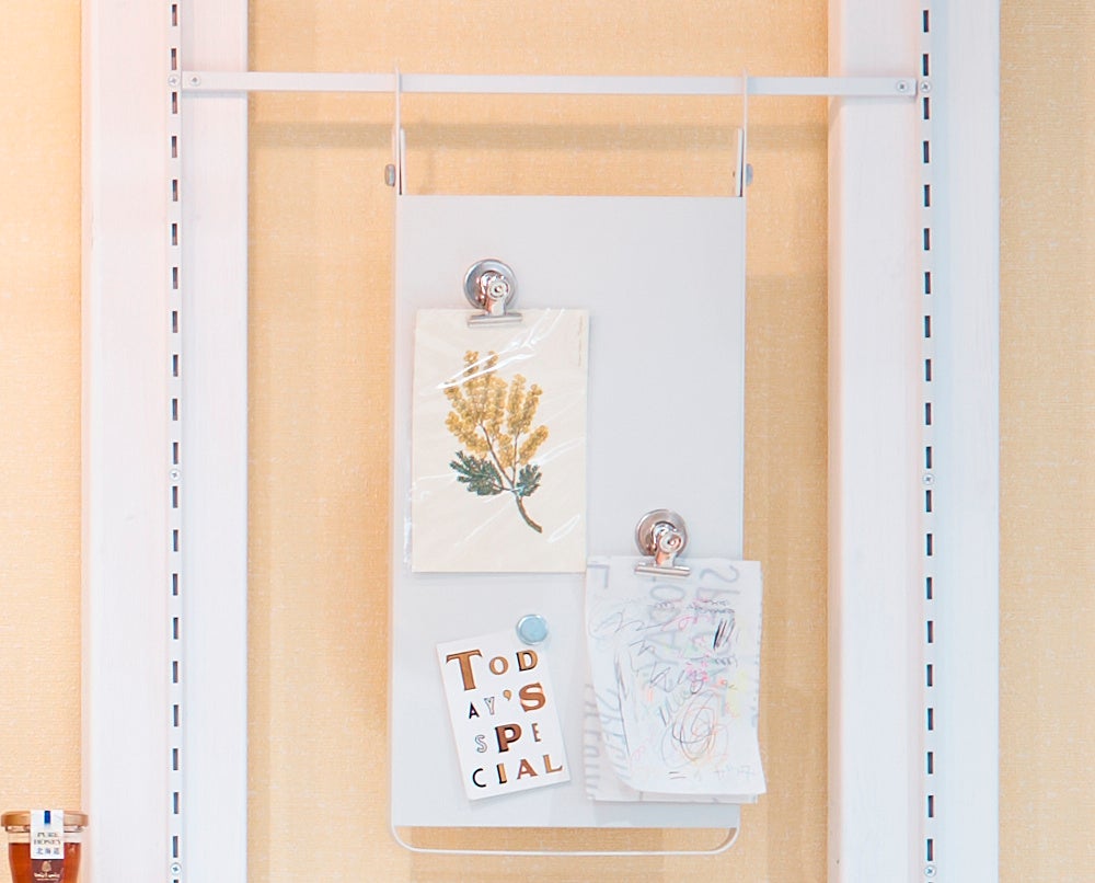 賃貸でも立てられるつっぱり柱にレールを取り付けることで、暮らしに合わせてどこでも好きなところに棚を設置出来る便利なスペースが完成。上段は写真をファブリックパネルでディスプレイ、下段は使用頻度の高いグラスを取り出しやすい高さに収納しています。さらに、マグネットツールを活用すると、キッチンタイマーやちょっとしたメモを見やすくおしゃれに収納できる理想の空間に!