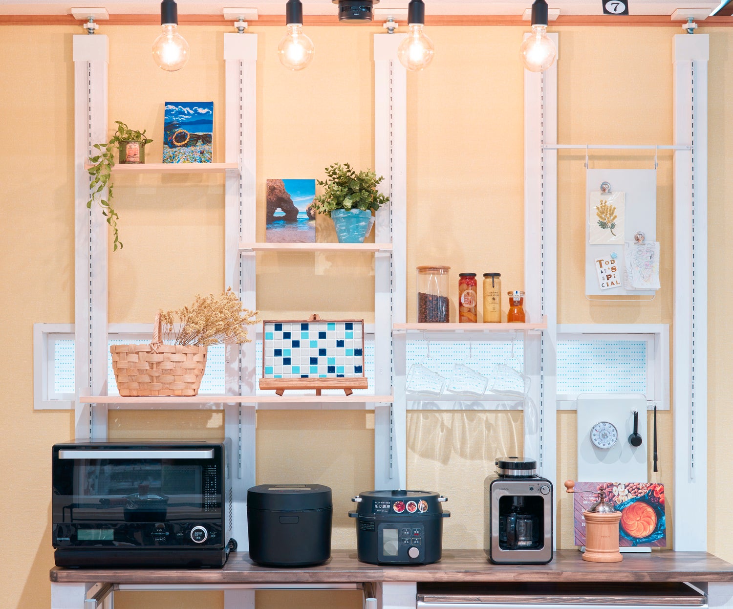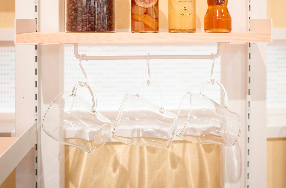 店内には、整理収納アドバイザー目線で片づけしやすいキッチン収納をDIY。使用頻度や使用用途別に配置するなど家族全員がどこに戻したら良いのか分かりやすい提案となっています。