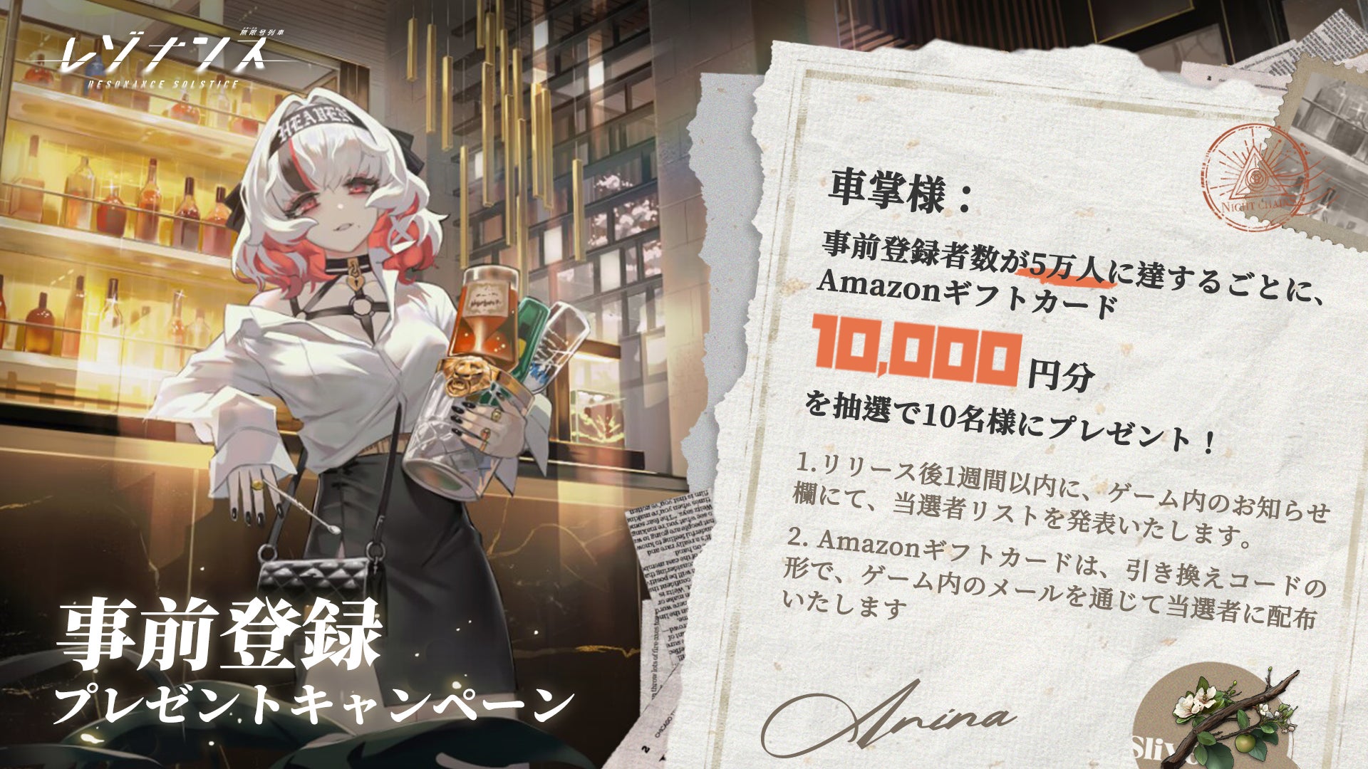 事前登録者数が5万人に達するごとに、Amazonギフトカード10,000円分を抽選で10名様にプレゼント。