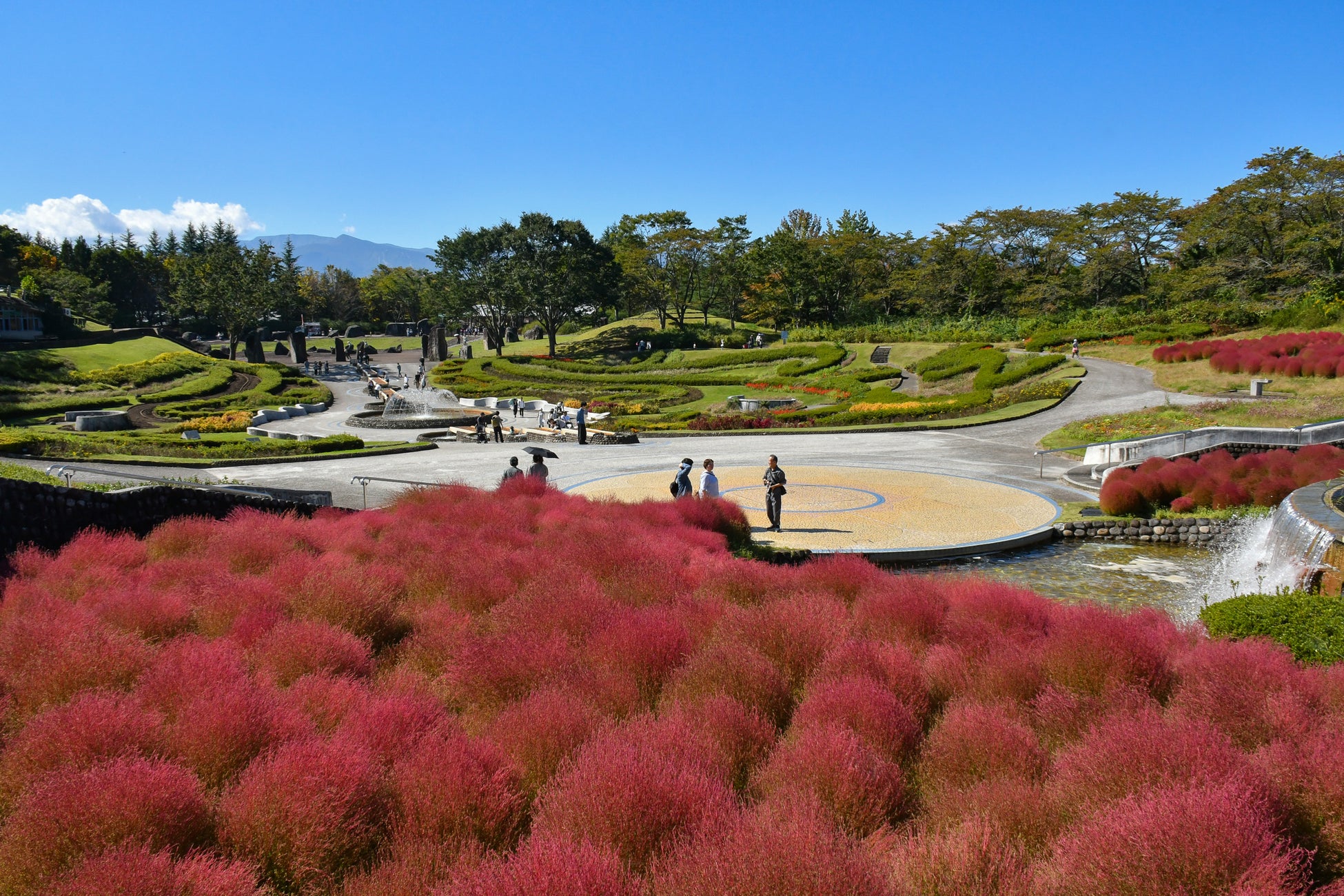 秋色のコキア 紅葉見頃 & 『みちのくふるさと秋灯り』開催(国営みちのく杜の湖畔公園) 国営みちのく杜の湖畔公園(宮城県柴田郡川崎町)では、合計7,000本のコキアが真っ赤に