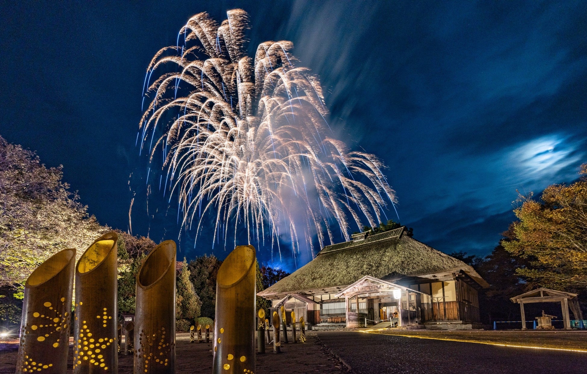 11月1日(土)~4日(月振)、8日(金)~10日(日)の計7日間、夜間ライトアップイベント『みちのくふるさと秋灯り』を開催。南地区のエントランス付近から東北6県の古民家を移築・展示しているふるさと村にかけて、LEDライトでのライトアップやプロジェクションマッピング、風情のある提灯などで夜間の空間演出を行います。イベント期間中の11月9日(土)には約300発の打ち上げ花火も実施予定です。