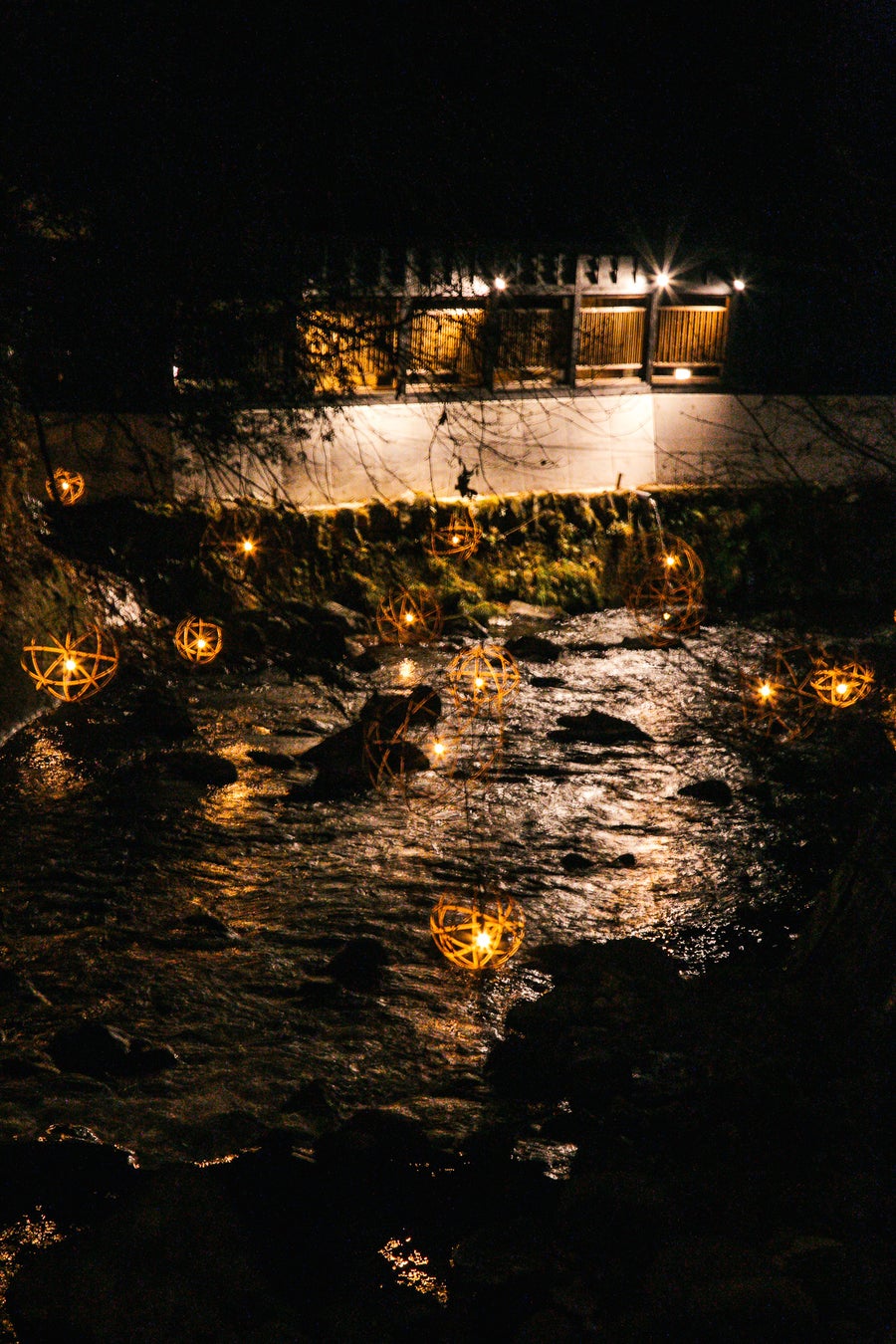 2012年の冬から始まり、今年で13回目を迎える「湯あかり」ライトアップ。球体状の「鞠灯篭」約300個と、筒状で高さ2mの「筒灯篭」を自然の景観に溶け込むように配置して、17時半から21時半まで明かりを灯します。