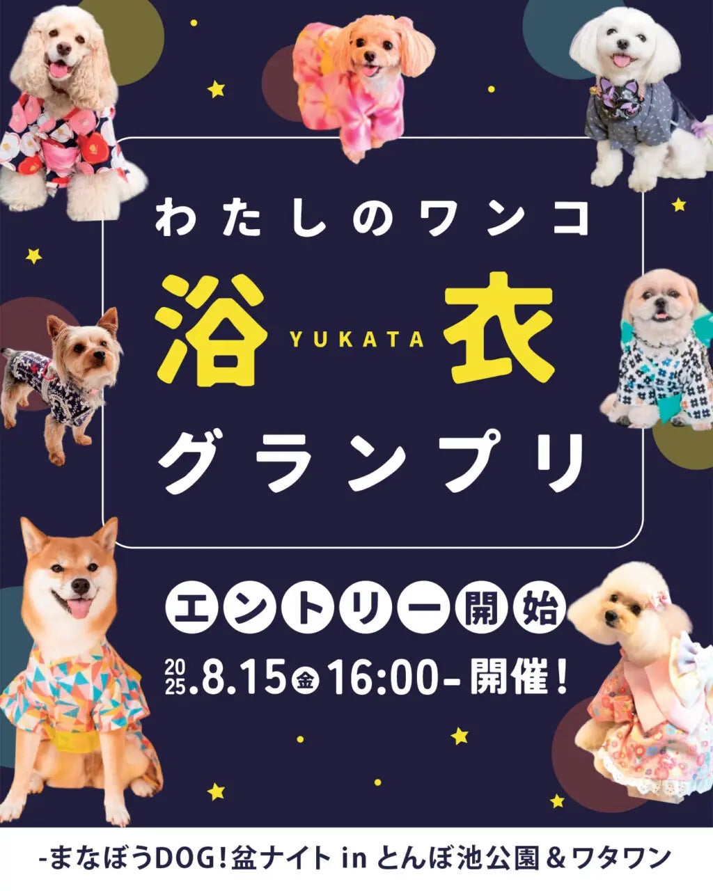\8/15・16開催!/夏の夜を愛犬と満喫!【まなぼうDOG!盆ナイト】とんぼ池公園&ワタワンで同時開催!浴衣姿のわんこが主役!『わたしのワンコ浴衣グランプリ』やワンコマルシェ、ペット防災体験まで