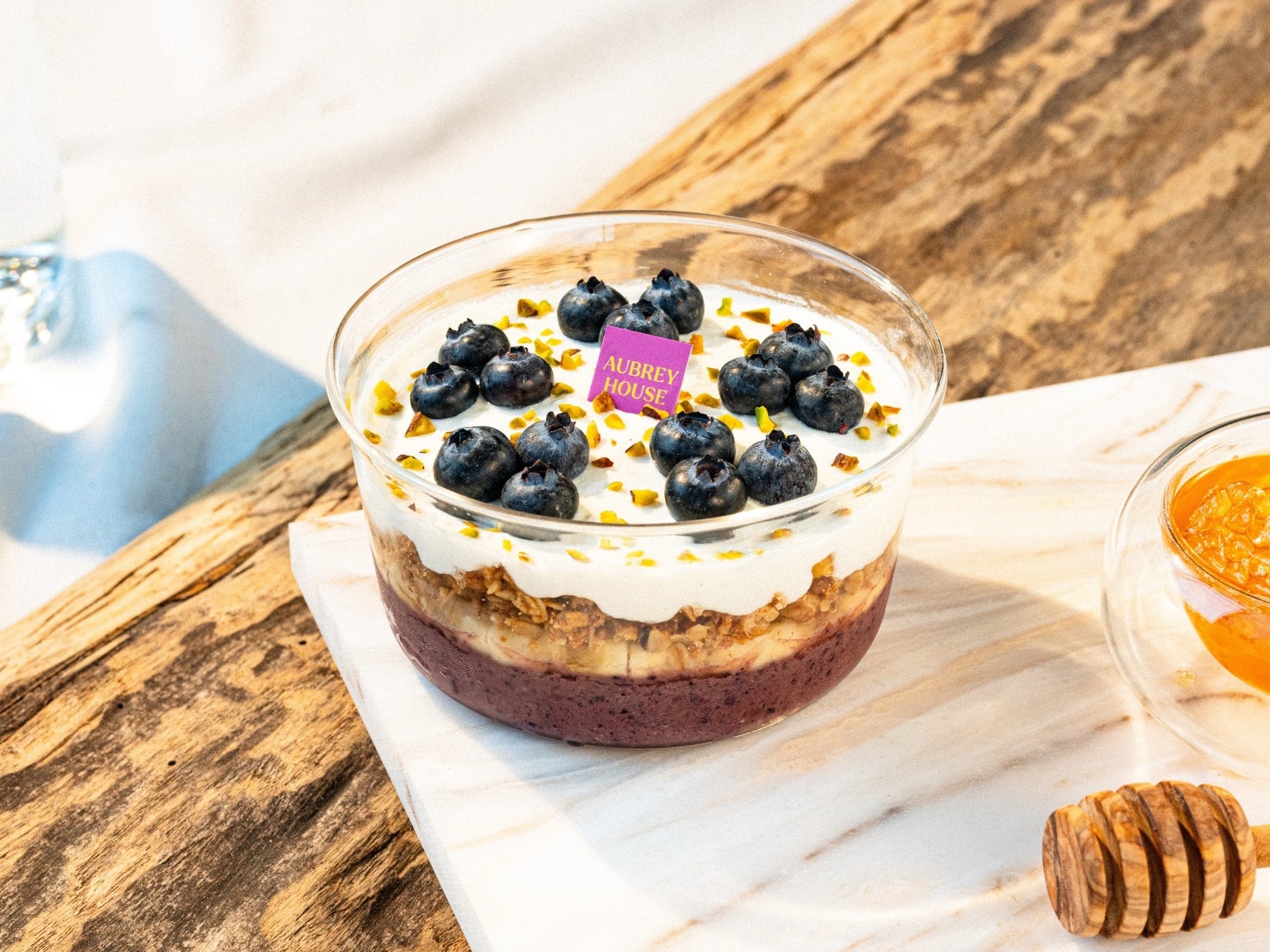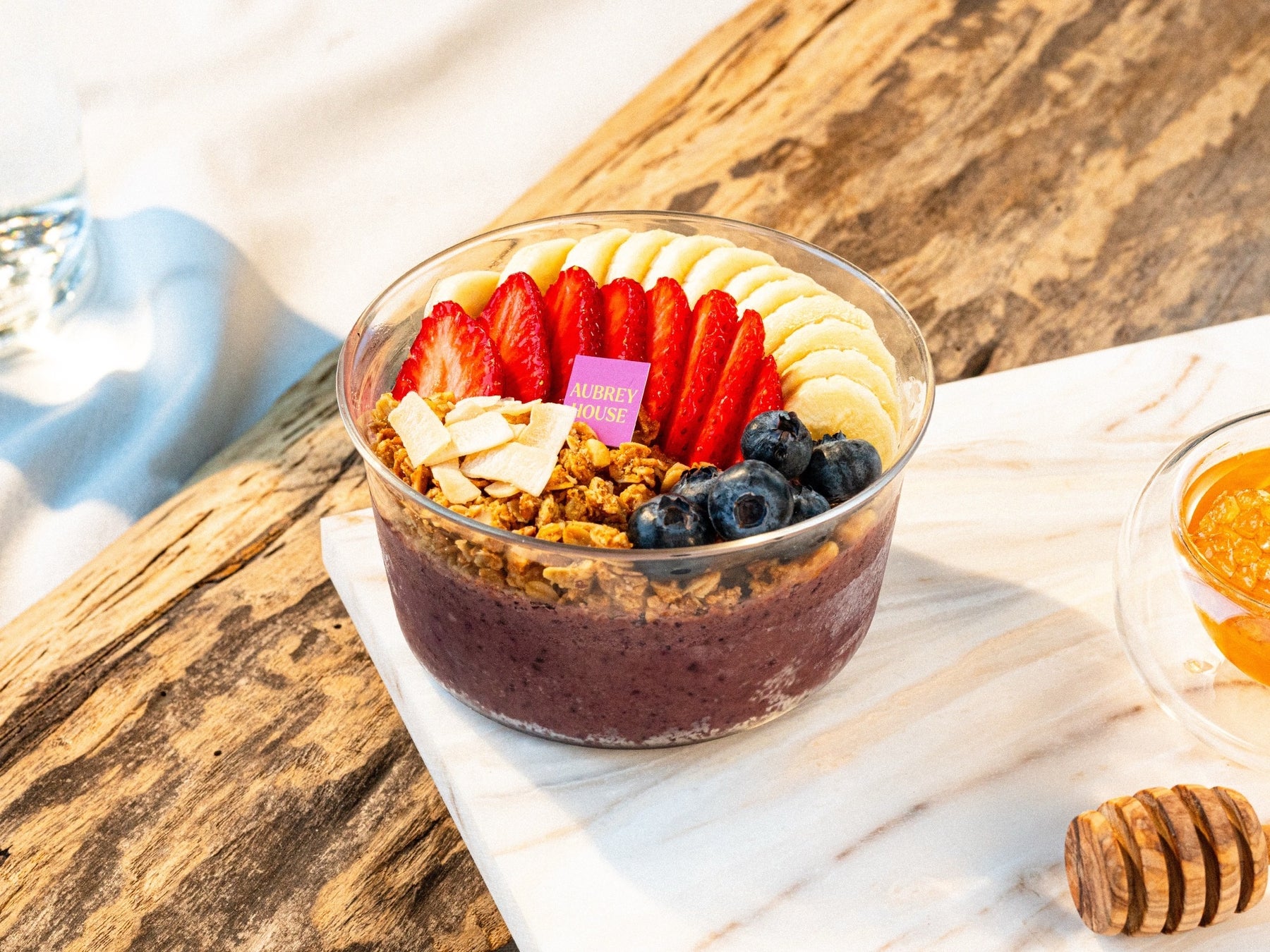 Aubrey Houseは、アサイー×グリークヨーグルトを掛け合わせた看板商品のオリジナルボウルを中心に人気上昇中!100%オーガニックの特製アサイーにバナナ、グラノーラ、グリークヨーグルトを重ね、、その上に新鮮なフルーツをたっぷりと盛り付けたボウルとなります。